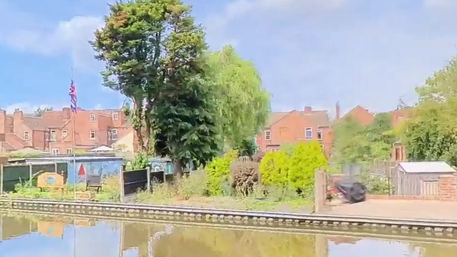 - Canal aspect: This house has a long garden, ending with a nice gravelled canalside terrace, on the offside of the Trent and Mersey Canal. You can see a flag by the canal on the right in the agent's photos, so in the Streetview image below, I think the property is the one in the centre, to the right of the flag, and the area by the canal has been cleared since this was taken. Notice the nice armco edge? I thought there might be a possibility of a short mooring here, but on Streetview I can't see a single boat - curious. This is a nice long cul-de-sac with foot access to the sports fields at the end. Parking space is at a premium - it can get a bit frantic at school drop off and pick up times - so the parking area at the front is a big advantage!